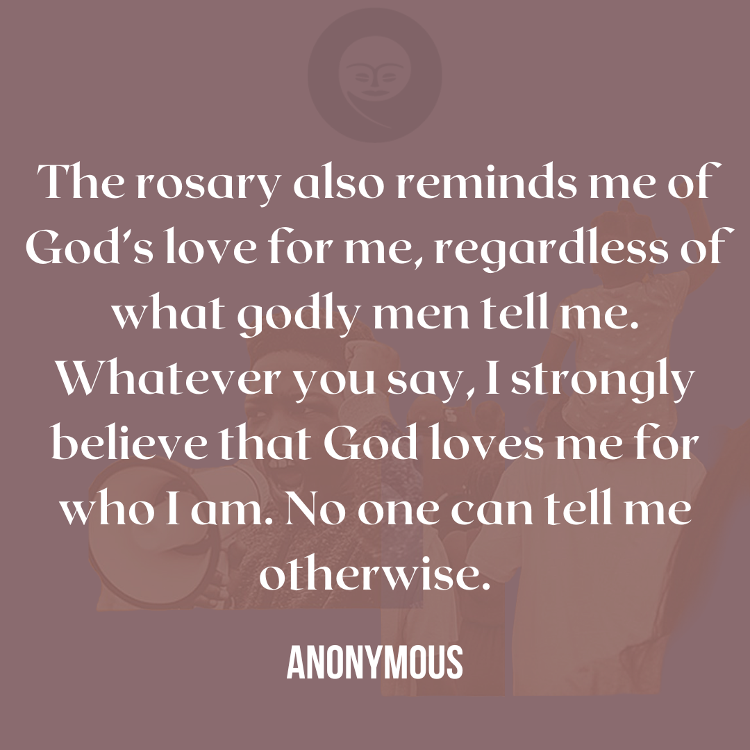 I chose the rosary because it reminds me of my family. It also reminds me of God’s love for me, regardless of what godly men tell me. Whatever you say, I strongly believe that God loves me for who I am. No one can tell me otherwise. I believe in God, and I always find solace in Him. I always carry my rosary and I use it often.